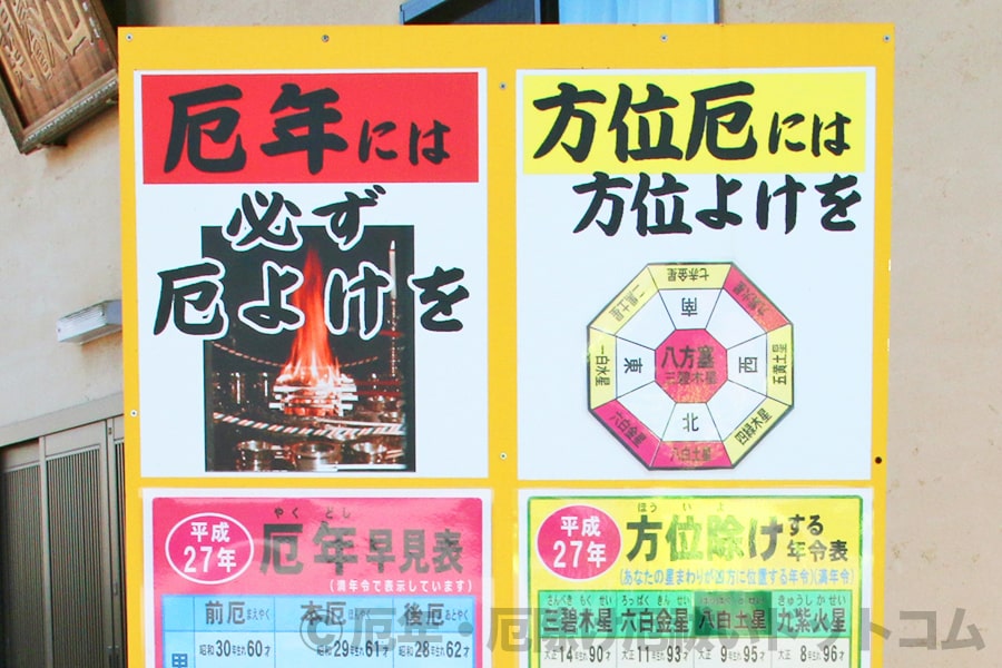 ※実際の寺院に掲げられた八方塞がりや凶年を伝える年盤と方除け・八方除けの案内板の様子|画像提供:厄年・厄除け厄祓いドットコム